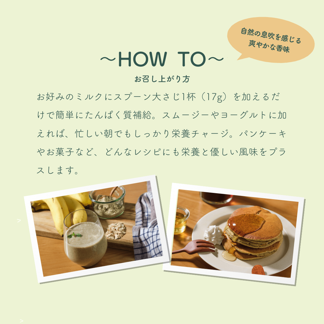 1日約17g を目安にお召し上がりください。ミルクやスムージー、ヨーグルトに加えるだけで、忙しい朝でもしっかり栄養チャージ。パンケーキなどのお菓子作りにも大活躍!