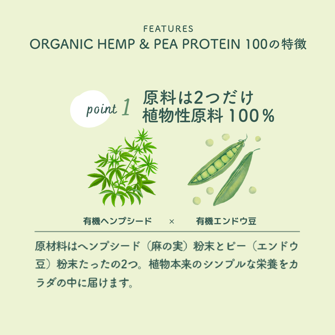 原材料はヘンプシード(麻の実)粉末とピー(エンドウ豆)粉末たったの2つ。植物本来のシンプルな栄養をカラダの中に届けます。