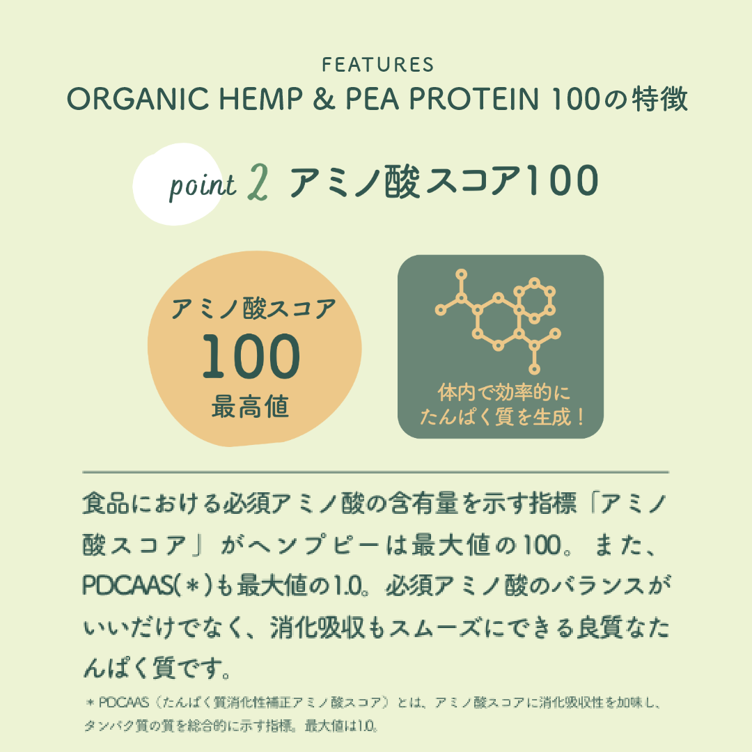 食品における必須アミノ酸の含有量を示す指標「アミノ酸スコア」がヘンプピーは最大値の100。また、PDCAAS(*)も最大値の1.0。バランスがいいだけでなく、消化吸収もスムーズにできる良質なたんぱく質です。